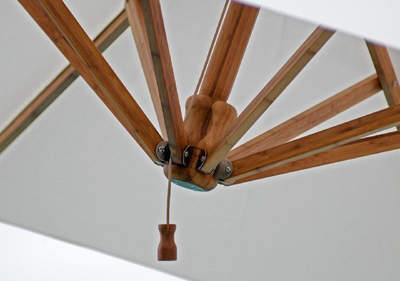 ![]() | 1 = Total height, 2 = Open height, 3 = Closed height | The pole, ribs, hub, runner and finial are all made using laminated bamboo. All metal fittings are 304 stainless steel. | A double pulley and rope system for easy opening and closing of parasol. |